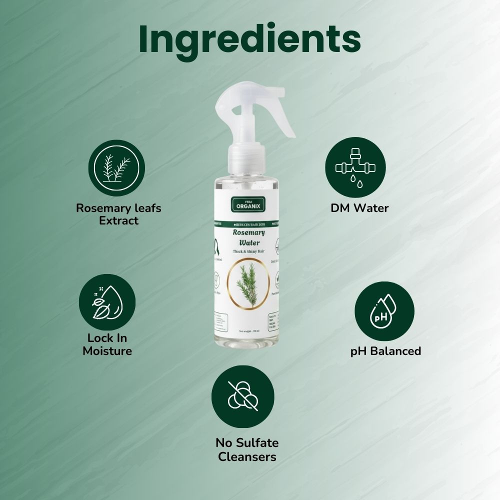 Veda Organix Rosemary Water for Hair Growth is a lightweight, refreshing hair mist that helps reduce hair fall, strengthen roots, and improve scalp health. A natural choice among trusted haircare products in India for daily hair and scalp care.